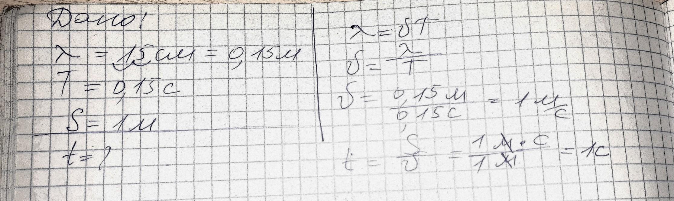Мальчик Инокентий сидя в ванной запустил волну, он заметил, что её длина равна 15 см. За сколько секунд волна добежит до бортика ванной, если расстояние от Инокентия до бортика 1м, а период колебания волны 0.15 сек.