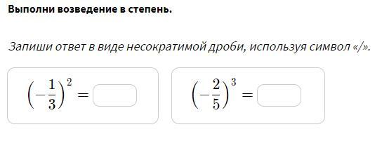 Отрицательное число в квадрате - положительное число. Чтобы возвести дробь в определенную степень необходимо возвести её числитель и знаменатель в эту степень:
