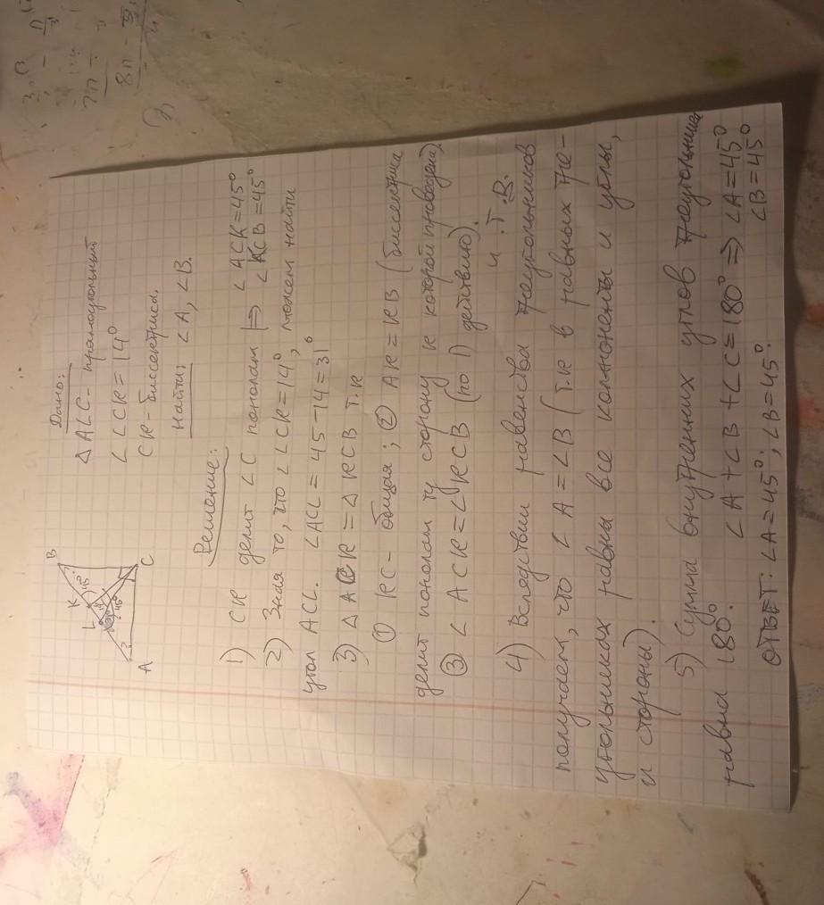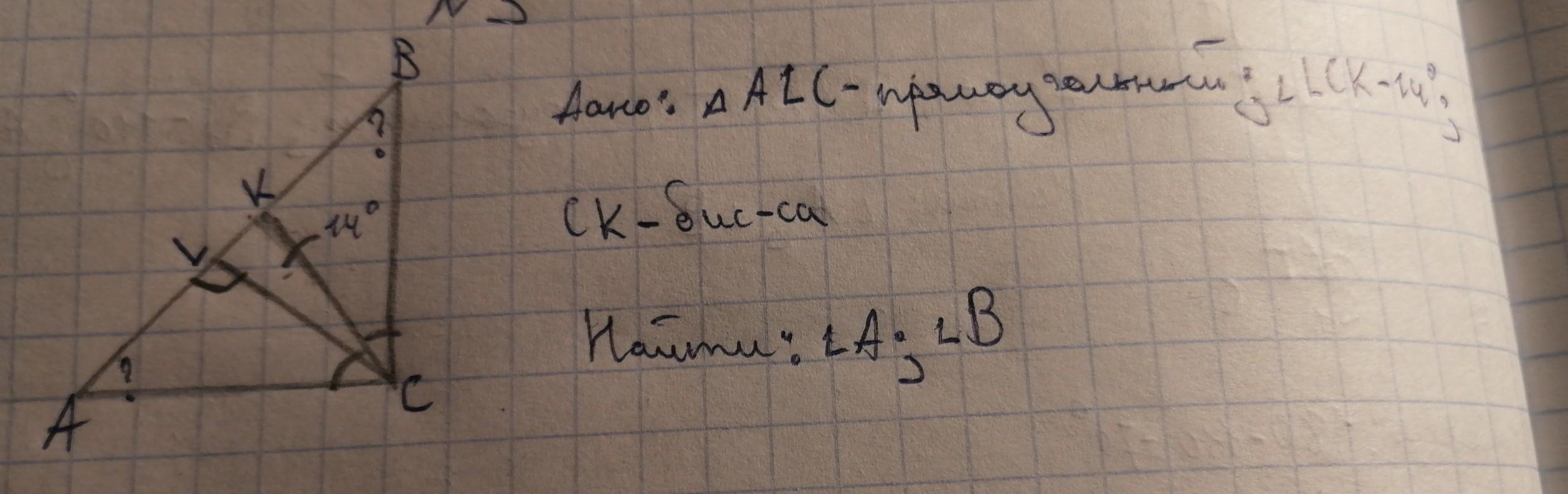 Так как биисектриса делит <АСВ на два равных угла,то <LCA=<ВСК=90:2=45.
