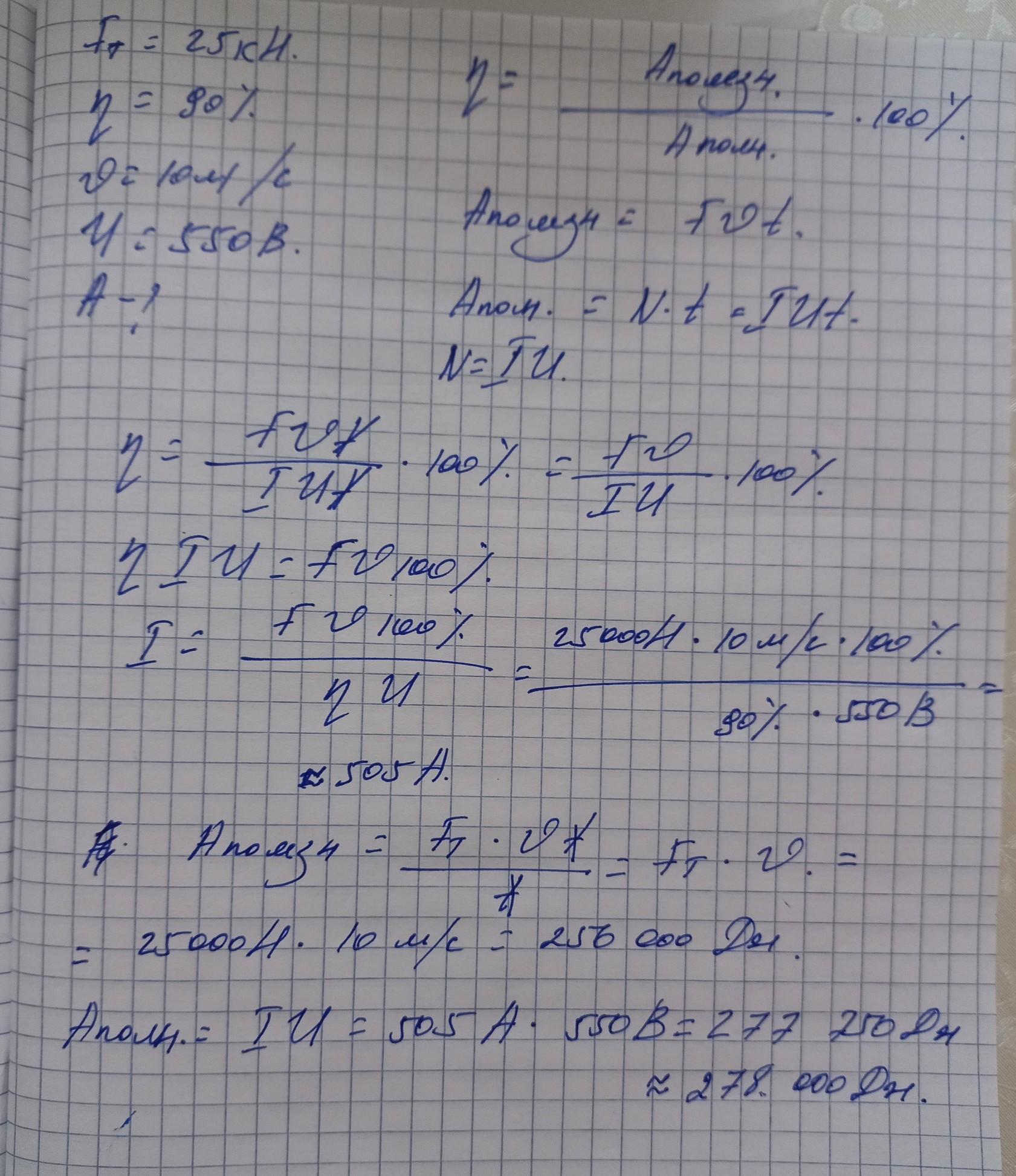 6. Трамвай с тягой двигателя 25 кН и КПД 90 % плавно движется со скоростью 10 м/с, если напряжение в сети 550 В, Определить работу тока, движущего трамвай. НУЖНО НАЙТИ РАБОТУ!!!