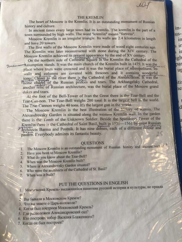 КРЕМЛЬ Сердце Москвы – Кремль. Это выдающийся памятник русской истории и культуры. В древности в каждом крупном городе был свой кремль. Кремль – это часть города, окруженная высокими стенами. Слово «кремль» означает «крепость». Московский Кремль представляет собой неправильный треугольник. Его стены имеют длину 2,4 километра и имеют 20 башен. Первые стены Московского Кремля были деревянными восемь веков назад. Позже Кремль был перестроен из камня в XIV веке. Московский Кремль приобрел свой первоначальный вид к концу XV века. С северной стороны Соборной площади Кремля стоит Успенский собор. Это была главная церковь Кремля, построенная в 1475 году. Здесь короновались цари и усыпальница митрополитов. Его стены и колонны покрыты фресками и в нем хранятся замечательные иконы. Ближе к реке находится собор Благовещенского святилища, домашняя часовня русских князей и царей. Архангельский собор, еще одна реликвия русского зодчества, был усыпальницей московских великих князей и царей. У подножия Колокольни Ивана Великого находятся Царь-колокол и Царь-пушка. Царь-колокол весит 200 тонн. Это самый большой колокол в мире. Царь-пушка весит 40 тонн. Это самая большая пушка в мире. Московский Кремль — лучшая иллюстрация истории России. Александровский сад расположен вдоль западной кремлевской стены, В саду находится Могила Неизвестного Солдата. Рядом со Спасской башней Кремля находится Собор Василия Блаженного, построенный в 155-1561 годах великими русскими зодчими Бармой и Постником. Он имеет девять куполов, каждый разной формы и формы. Все восхищаются его фантастической красотой. 25