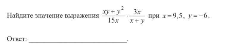 перетворимо:У(Х+У)/15Х*3Х/Х+У⇒скоротимо, отримаємо:У/5Х Х=-9,5 У=-6 -6/-47,5=0,126