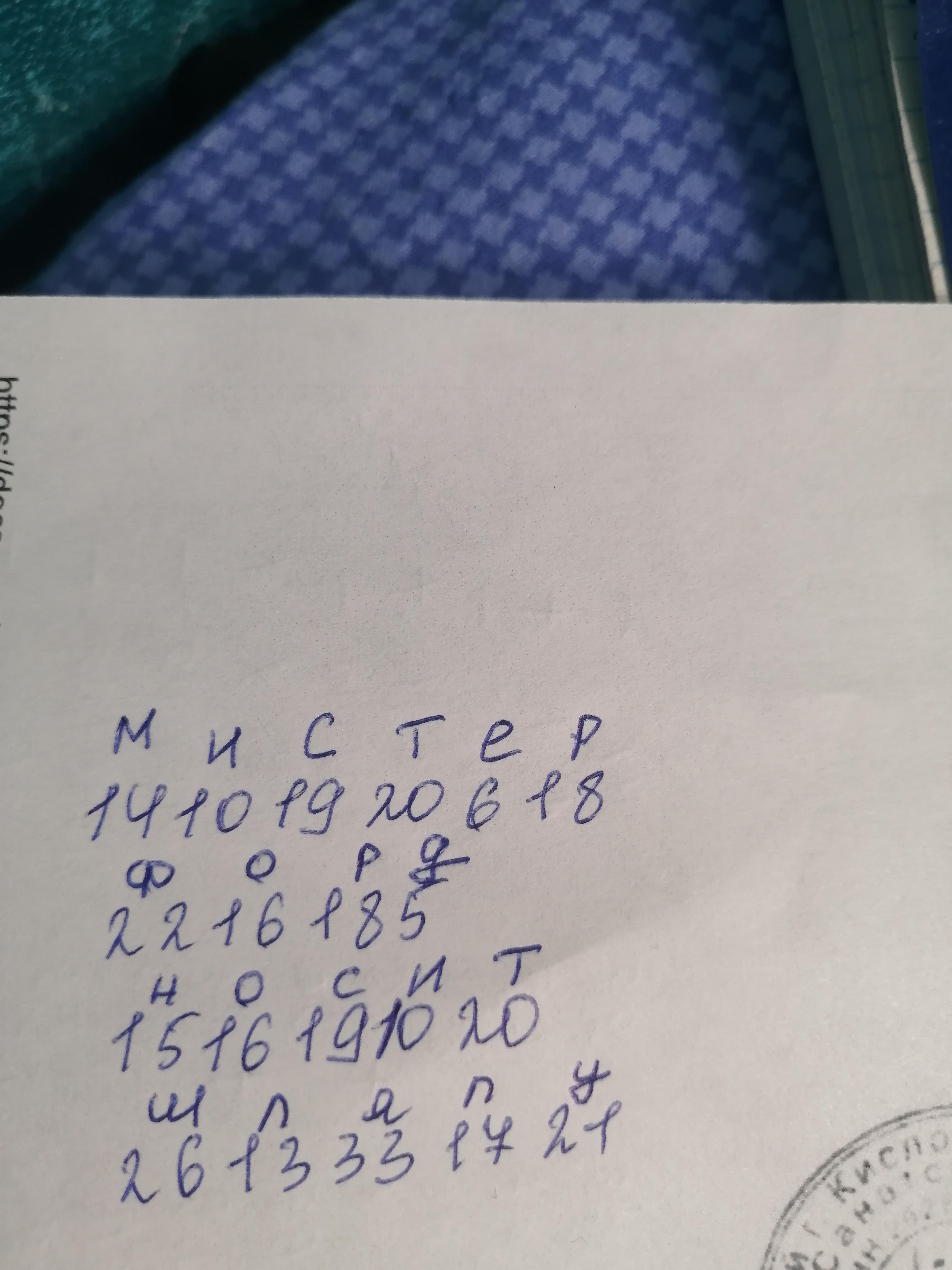 Неизвестно кто неизвестно кому отправил зашифрованную записку. Каждая буква была заменена на свой порядковый номер в русском алфавите. Расшифруй записку и ответь на вопросы.14101920618