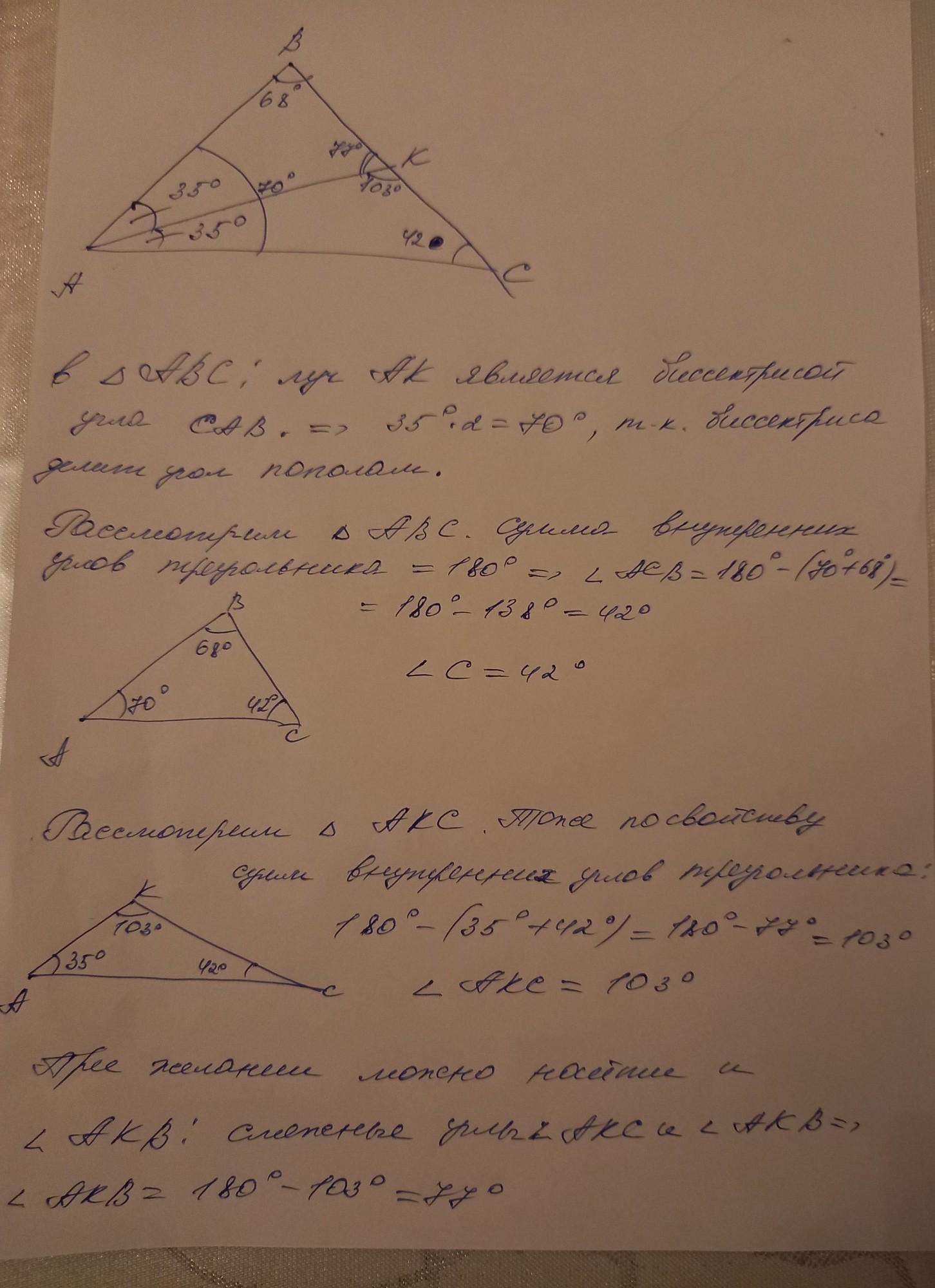 надо сделать по свойству биссектрисы и сумма внутренних углов любого треугольника равнам180 градусов. а биссектриса делит любой угол пополам.