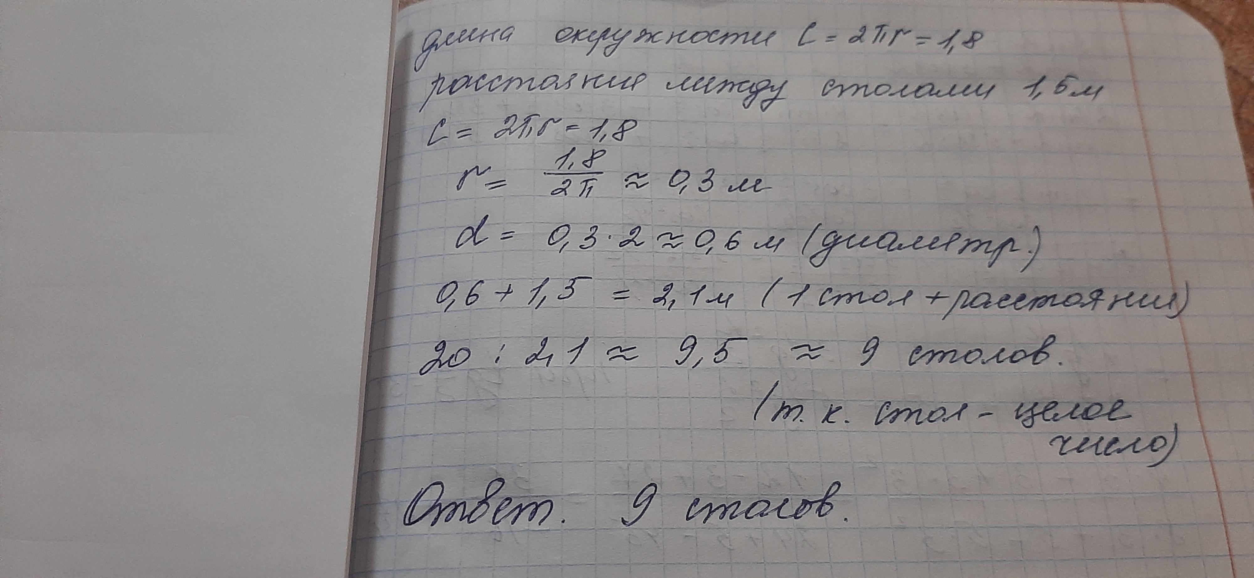 Сколько можно расположить в ряд круглых столов, длина окружности которых равна 1,8 метра, так, чтобы расстояние между столами было 1,5 метра?
