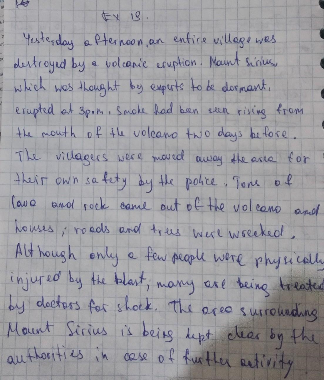 19 Rewrite the following passage in the passive. Yesterday afternoon, a volcanic eruption destroyed an entire village. Mount Sirius, which experts thought was dormant, erupted at 3 pm. Tourists had seen smoke ri- sing from the mouth of the volcano two days before. The police moved the villagers away from the area for their own safety. Tons of lava and rock came out of the volcano and wrecked houses, roads and trees. Although the blast physically injured only a few people, doctors are treating many for shock. The authorities are keeping the area surrounding Mount Sirius. clear in case of further activity.