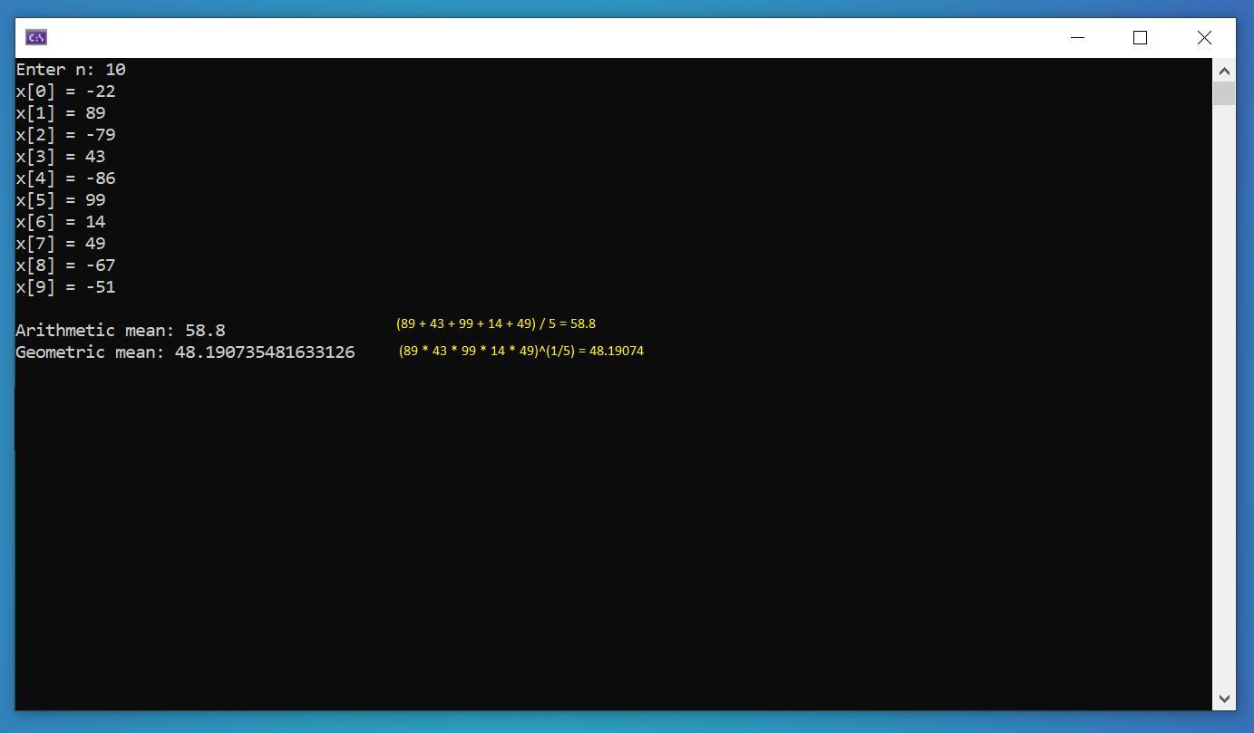 Console.WriteLine($"\nArithmetic mean: {arithmeticMean}");