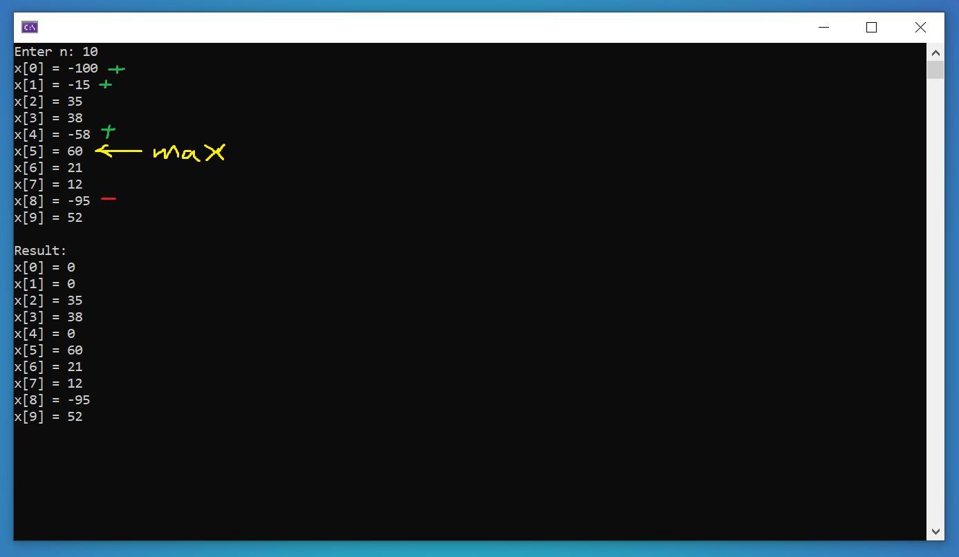 1) В заданном массиве Х(N) замените нулями все отрицательные компоненты, непосредственно предшествующие его максимальной компоненте (первой по порядку, если их несколько).