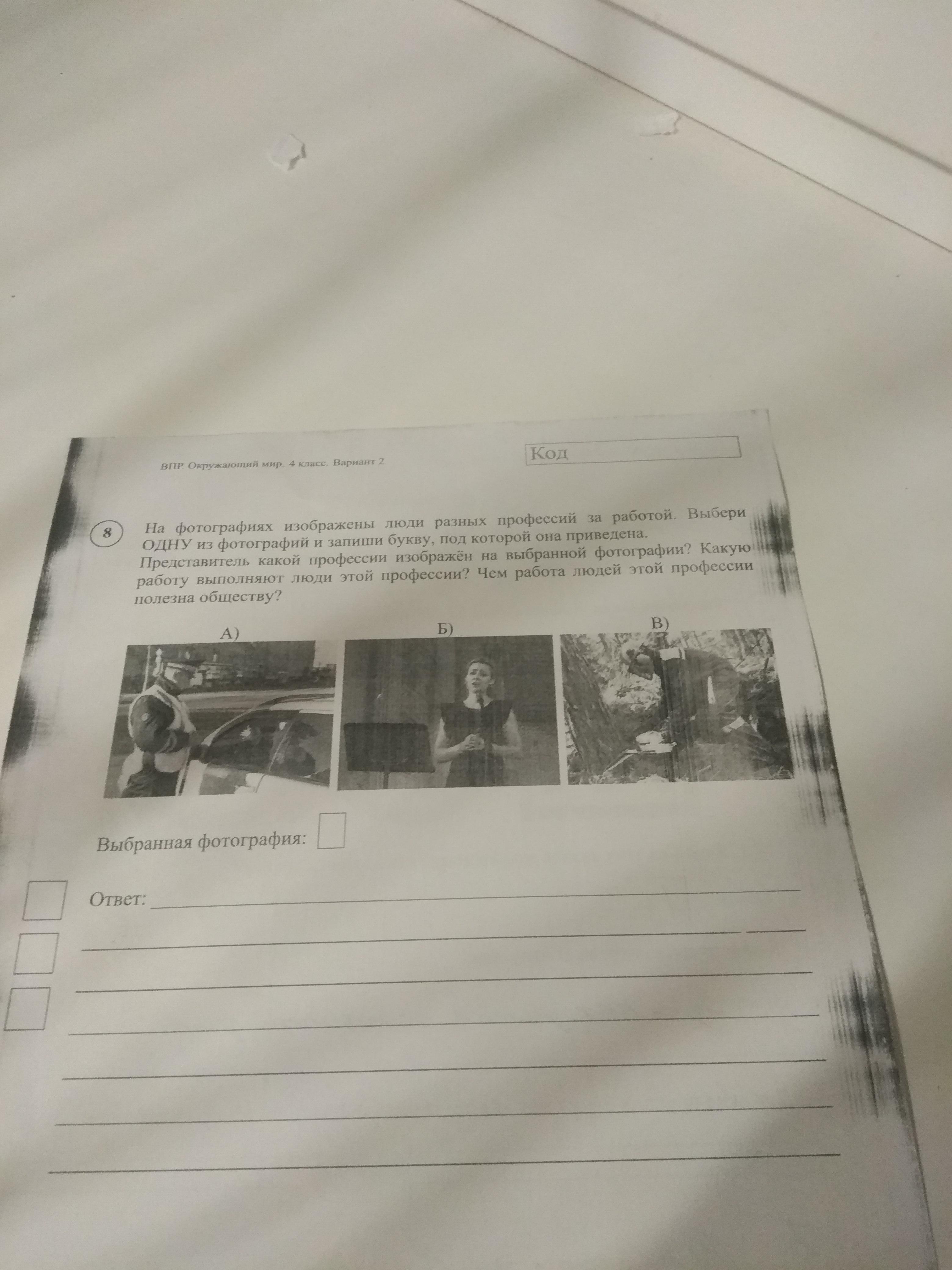 Помогите пожалуйста, на фотографиях изображены люди разных профессий за работой выбери одну из фотографий и запиши букву под которой оно приведено.представитель какой профессии изображён на выбранные фотографии? какую работу выполняет люди этой професси? Чем работа людей этой профессии полезна обществу?