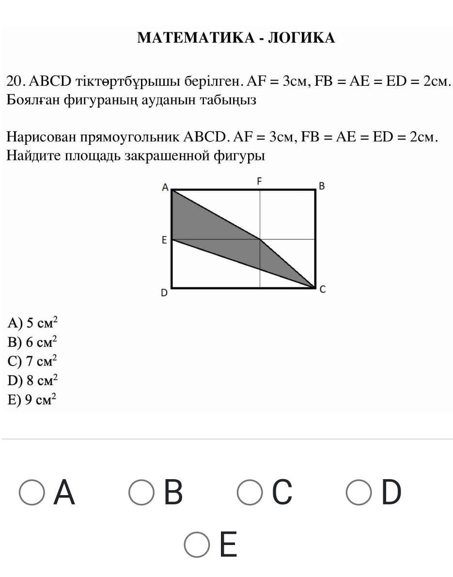 нарисован прямоугольник АБСД AF =3 см,FB=AE=ED=2 см найдите площадь закрашеной фигуры пожалуйста помогите