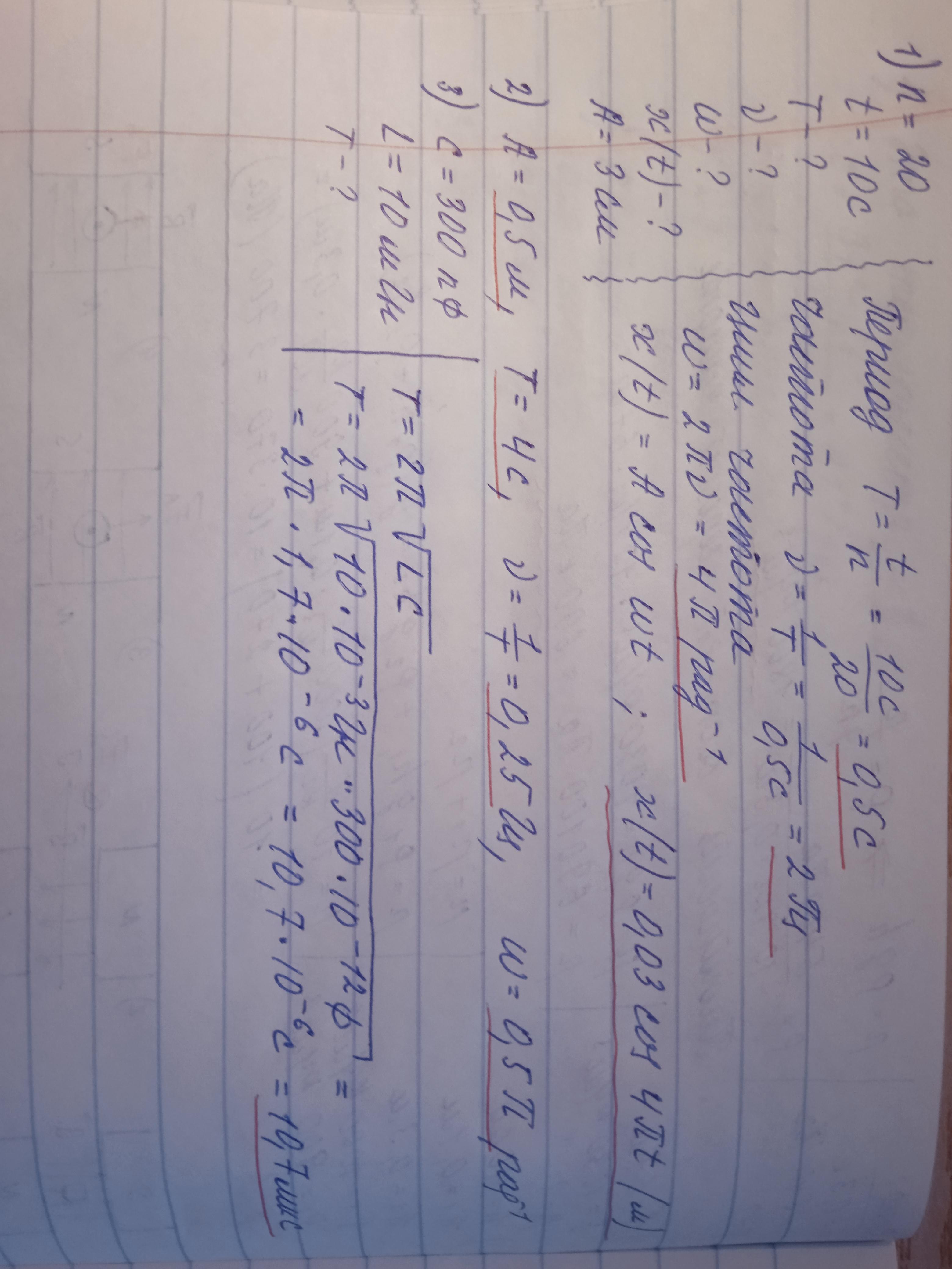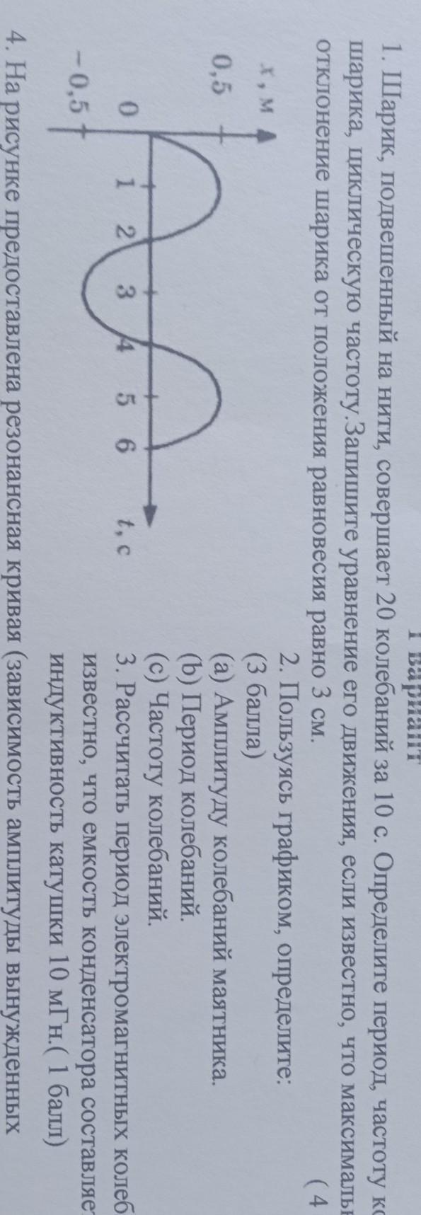 1. Шарик, подвешенный на нити, совершает 20 колебаний за 10 с. Определите период, частоту колебаний