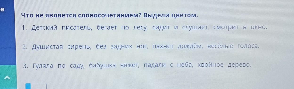 Что не является словосочетанием? Выдели цветом. 1. Детский писатель, бегает по лесу, сидит и слушает, смотрит вокно. 2. Душистая сирень, без задних ног, пахнет дождём, весёлые голоса. 3. Гуляла по саду, бабушка вяжет, падали с неба, хвойное дерево.