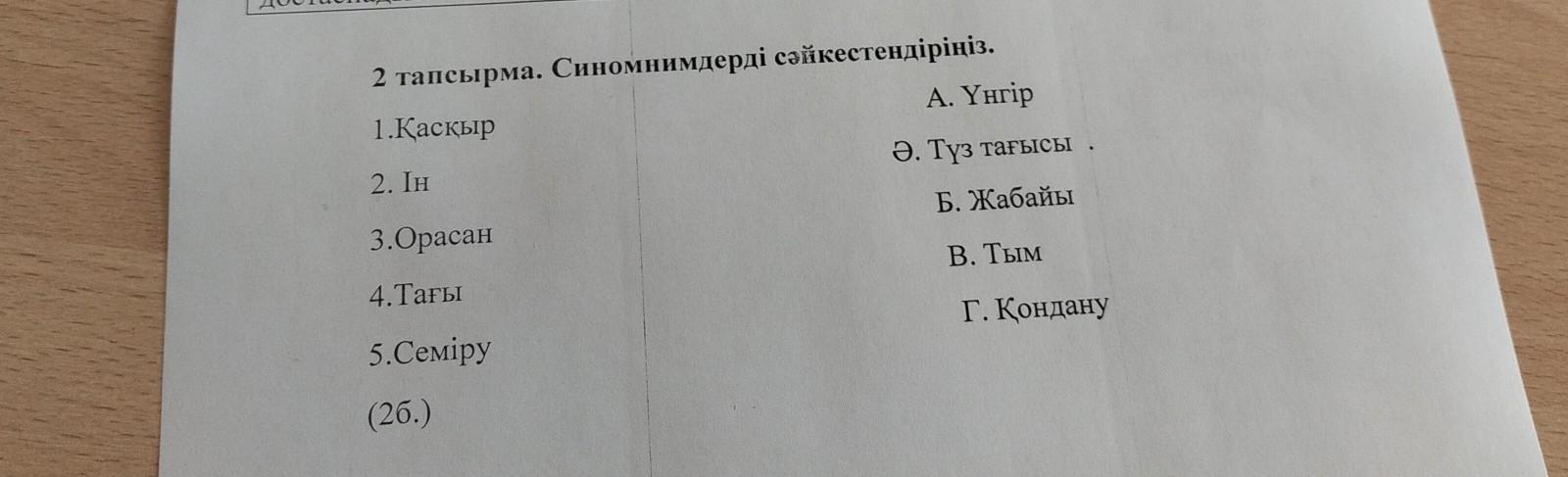 2 тапсырма. Синомнимдерді сәйкестендіріңіз. 1.Қасқыр A. Yнгір 2. Ін Ә. Түз тағысы . 3.Орасан Б. Жабайы 4.Тағы В. Тым 5.Семіру Г. Қондану (26.)