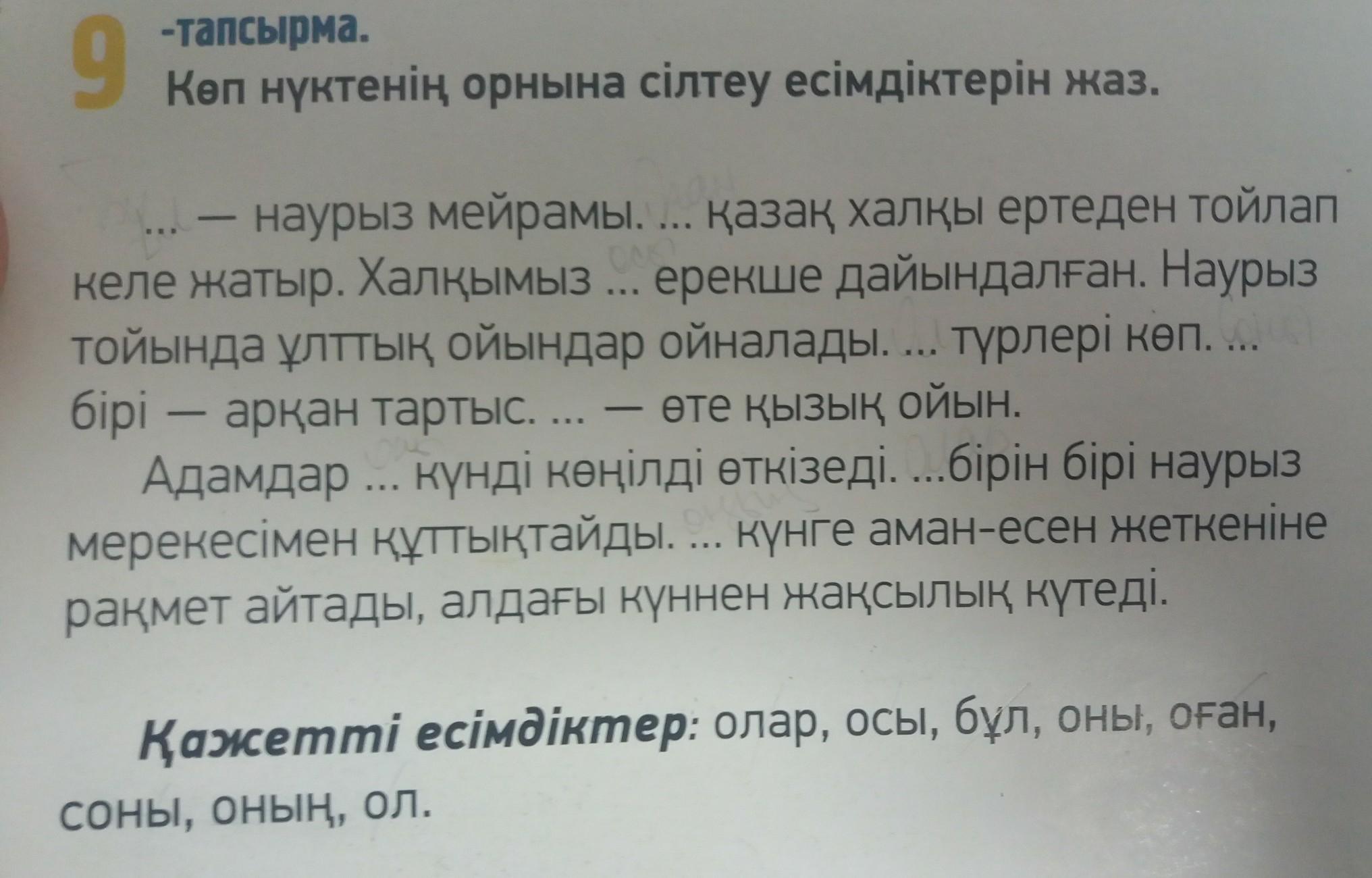 Бул Наурыз мейрамы.Оны казак халкы ертеден тойлап келе жатыр.Халкымыз оган ерекше дайындалган.Онын турлери коп.Онын бири аркан тартыс.Ол оте кызык ойын.Адамдар соны кунди конилди откизеди.Олар бирин бири Наурыз мерекесимен куттыктайды.Осы кунге.....