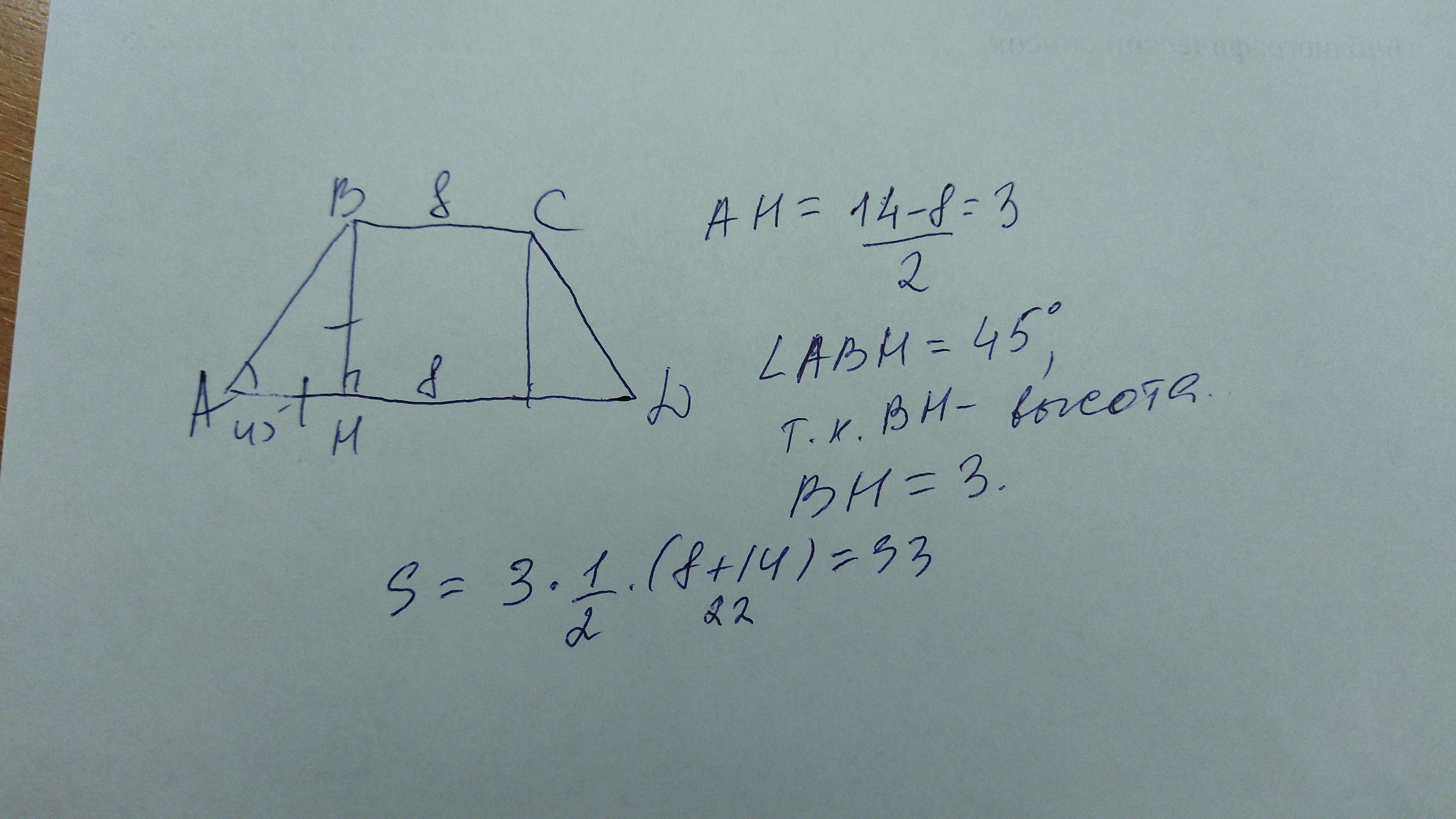 В равнобедренной трапеции, угол при основании равен 45°, а основания равны 8см и 14 см. Найдите площадь трапеции. ПОМОГИТЕ пожалуйста.