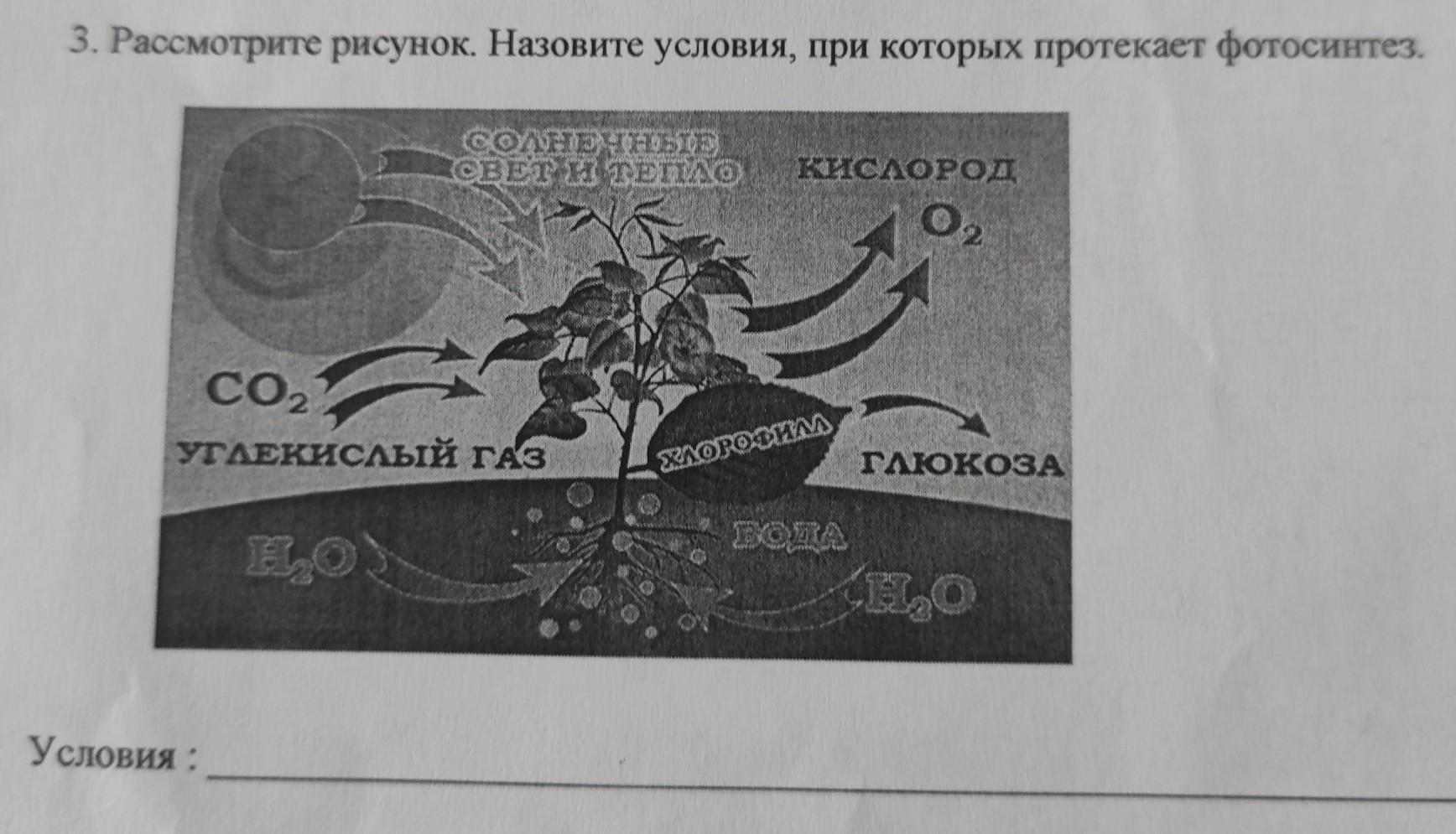 3. Рассмотрите рисунок. Назовите условия, при которых протекает фотосинтез. СРОЧНО!!! ДАМ 30 БАЛЛОВ
