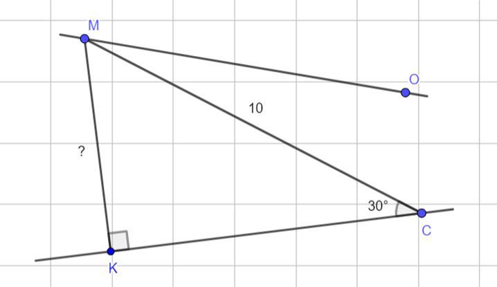 Из точки М взятой на прямой МО проведен перпендикуляр МК к прямой КС. Длина наклонной МС=10см, угол КСМ=30°. Найдите расстояние между прямыми МО и КС