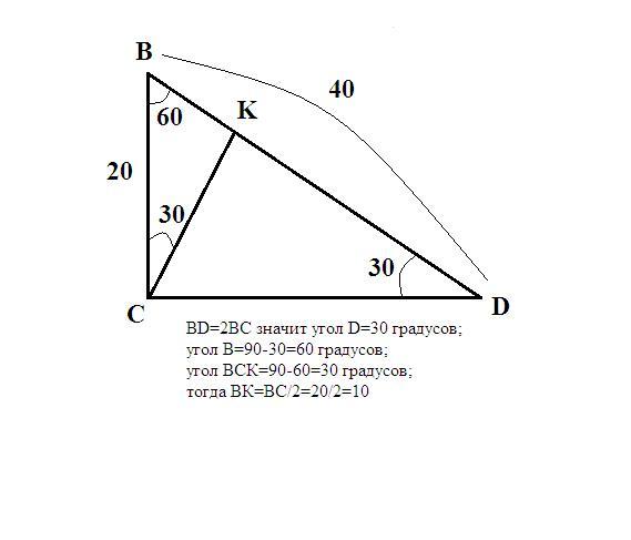 Задание 4. В прямоугольном треугольнике DBC (LC = 90°) провели высоту СК. Найти отрезок BK, если DB = 40 см, ВС = 20 см.