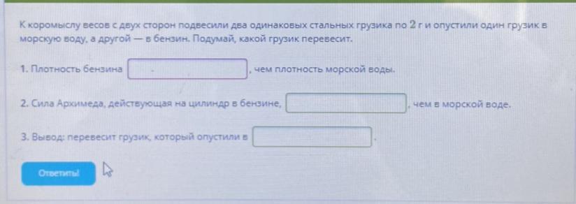 Плотность бензина меньше плотности морской воды, и сила Архимеда, действующая на грузик, в бензине меньше. Перевесит грузик, опущенный в бензин.