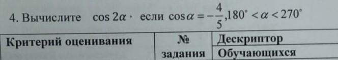 cos(2a) = cos²(a) - sin²(a) = cos²a - (1-cos²(2a)) = 2cos²(a)-1 = 2•16/25 - 1 = 32/25 - 1 = 7/25