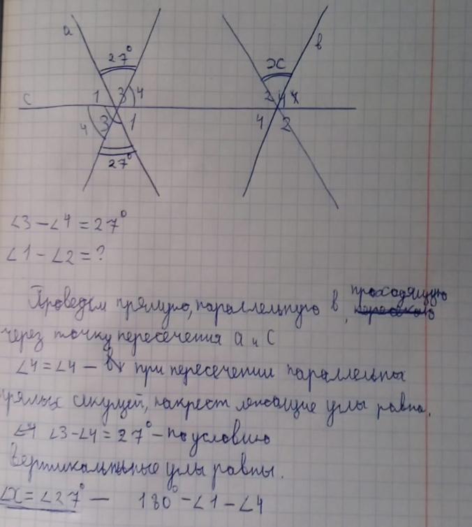 6. Прямая с пересекает прямые а и b. Зная, что 3-4=27°, найдите разность 22-21 (рисунок 4).