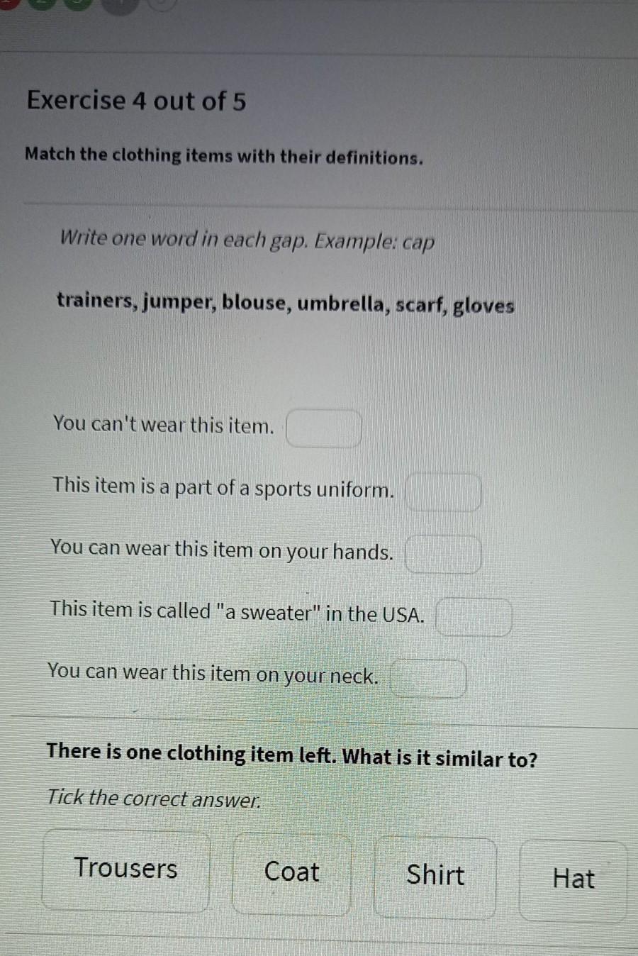 1.umbrella 2.trainers 3.gloves 4.jumper 5.scarf