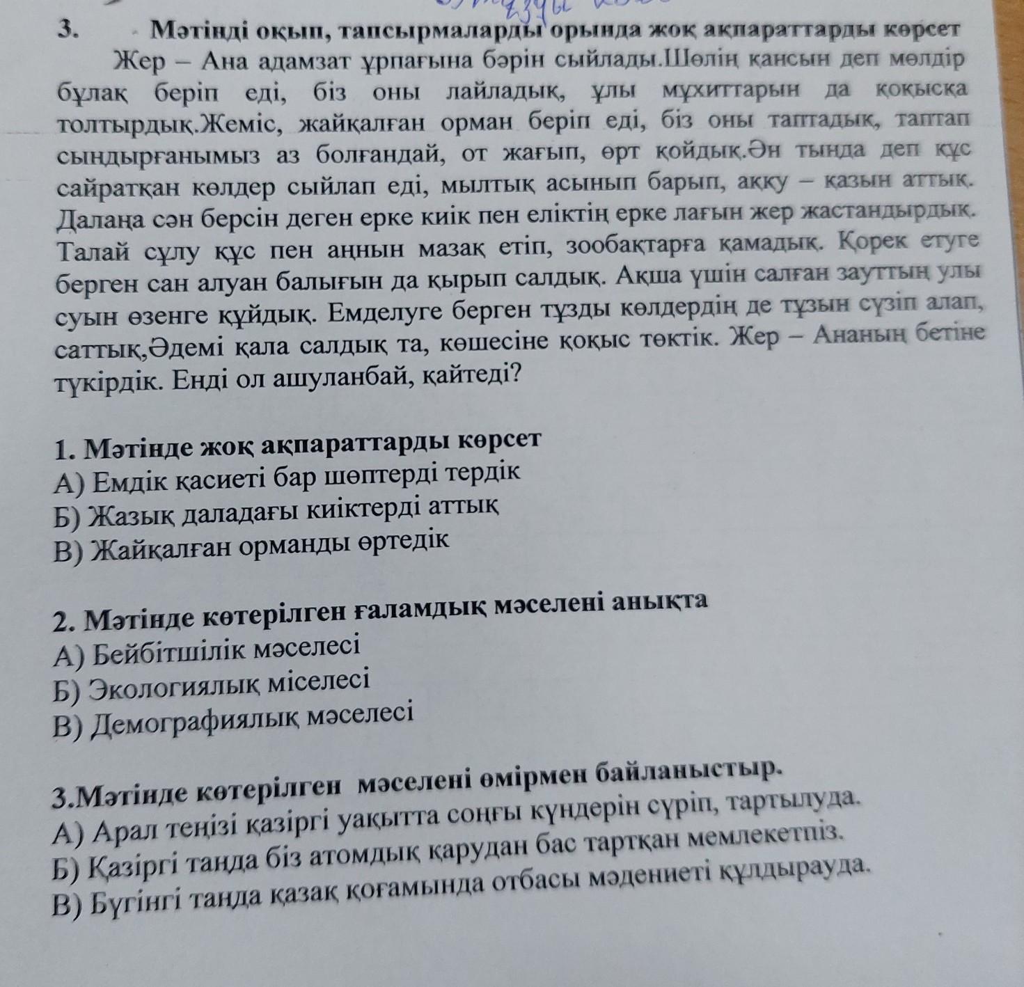 3. Мәтінді оқып, тапсырмаларды орында жоқ ақпараттарды көрсет Жер — Ана адамзат ұрпағына бәрін сыйлады.Шөлің қансын деп мөлдір бұлақ беріп еді, біз оны лайладық, ұлы мұхиттарын да қоқысқа толтырдық.Жеміс, жайқалған орман беріп еді, біз оны таптадық, таптап сындырғанымыз аз болғандай, от жағып, өрт қойдық. Ән тыңда деп құс сайратқан көлдер сыйлап еді, мылтық асынып барып, аққу – қазын аттық. Далаңа сән берсін деген ерке киік пен еліктің ерке лағын жер жастандырдық. Талай сұлу құс пен аңнын мазақ етіп, зообақтарға қамадық. Қорек етуге берген сан алуан балығын да қырып салдық. Ақша үшін салған зауттың улы суын өзенге құйдық. Емделуге берген тұзды көлдердің де тұзын сүзіп алап, саттық, Әдемі қала салдық та, көшесіне қоқыс төктік. Жер — Ананың бетіне түкірдік. Енді ол ашуланбай, қайтеді? - 1. Мәтінде жоқ ақпараттарды көрсет А) Емдік қасиеті бар шөптерді тердік Б) Жазық даладағы киіктерді аттЫҚ B) Жайқалған орманды өртедік 2. Мәтінде көтерілген ғаламдық мәселені анықта A) Бейбітшілік мәселесі Б) Экологиялық мiселесі В) Демографиялық мәселесі 3.Мәтінде көтерілген мәселені өмірмен байланыстыр. А) Арал теңізі қазіргі уақытта соңғы күндерін сүріп, тартылуда. Б) Қазіргі таңда біз атомдық қарудан бас тартқан мемлекетпіз. B) Бүгінгі таңда қазақ қоғамында отбасы мәдениеті құлдырауда.