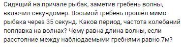 Сидящий на причале рыбак, заметив гребень волны, включил секундомер. Восьмой гребень прошёл мимо рыбака через 35 секунд. Каков период, частота колебаний поплавка на волнах? Чему равна длина волны, если расстояние между наблюдаемыми гребнями равно 7м?