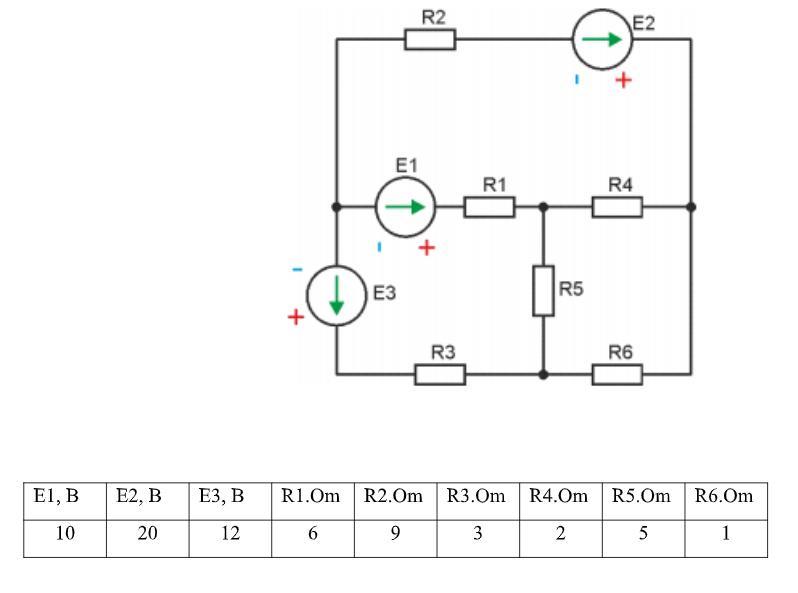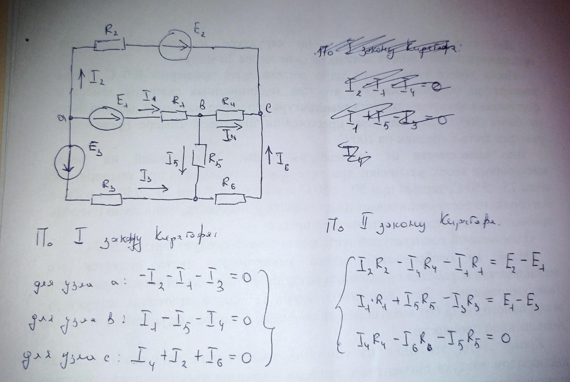 Для начало расставляем в условном поводке токи в ветвях. Затем записываем уравнения по 1 и 2 закону Кирхгофа. Количество уравнений для первого закона определяется: количество узлов минус один. На схеме 4 узла (a, b, c, d), поэтому будет 4 - 1 = 3 уравнения.