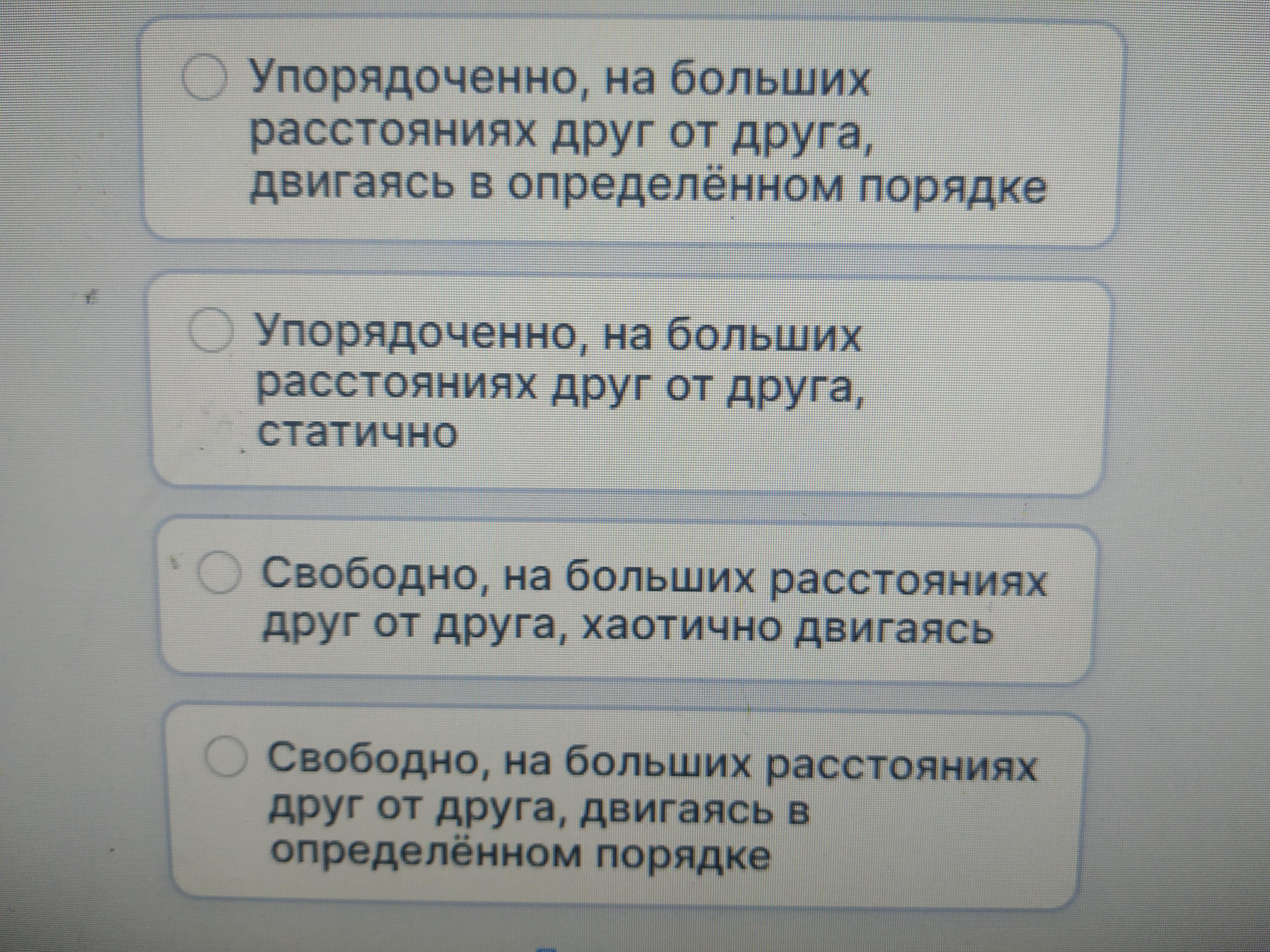 Ответ: Свободно, на больших расстояниях жруг от друга, хаотично двигаясь.