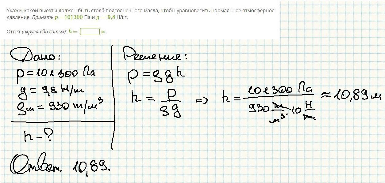 h = 101300 Па/9,8 м/с2 *925 кг/м3 = 11,2 м.