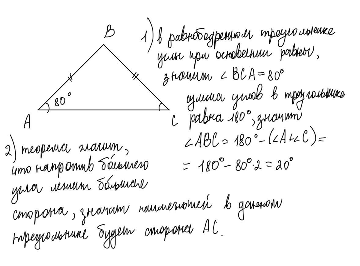 В равнобедренном треугольнике ABC (AB=ВС) угол при основа нии равен 80º. Какая сторона треугольника является наименьшей? a) AB; 6) BC; B) AC; r) AB и BC.