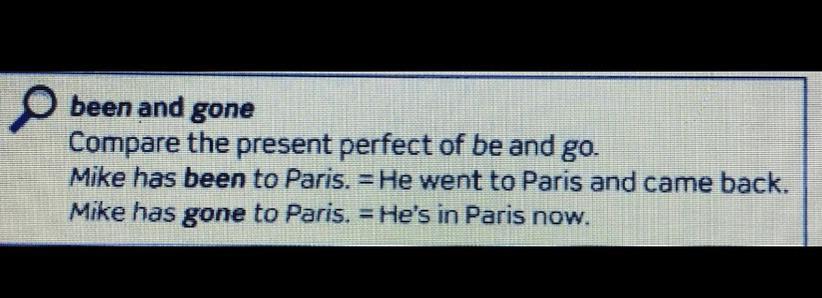 been and gone Compare the present perfect of be and go. Mike has been to Paris. = He went to Paris and came back. Mike has gone to Paris. = He's in Paris now.