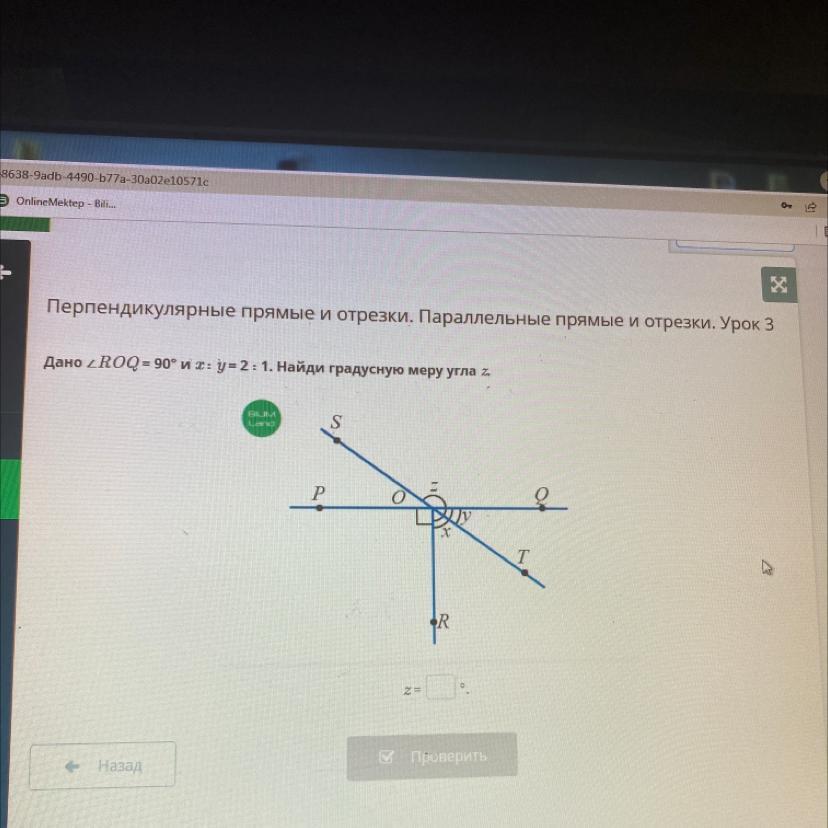 Дано zROQ= 90° их: y= 2:1. Найди градусную меру угла z.