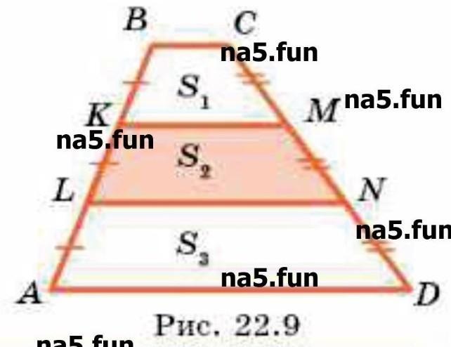 А еще проще можно рассуждать так. Проведем средние линии m, n и k верхней, средней и нижней трапеций. Очевидно, что средняя линия средней трапеции является также средней линией трапеции, чьими основаниями служат средние линии верхней и нижней трапеций. Остается вспомнить, что средняя линия трапеции равна полусумме оснований, а также то, что площадь трапеции равна произведению средней линии на высоту. Поэтому площадь верхней трапеции равна mh, площадь нижней трапеции равна kh, площадь средней трапеции равна