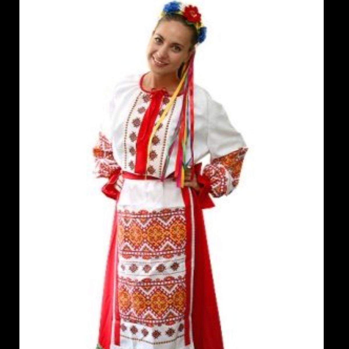 Ободок с цветами, рубаху белую с вышитым рисунком, юбке белую с узорами и фартучком