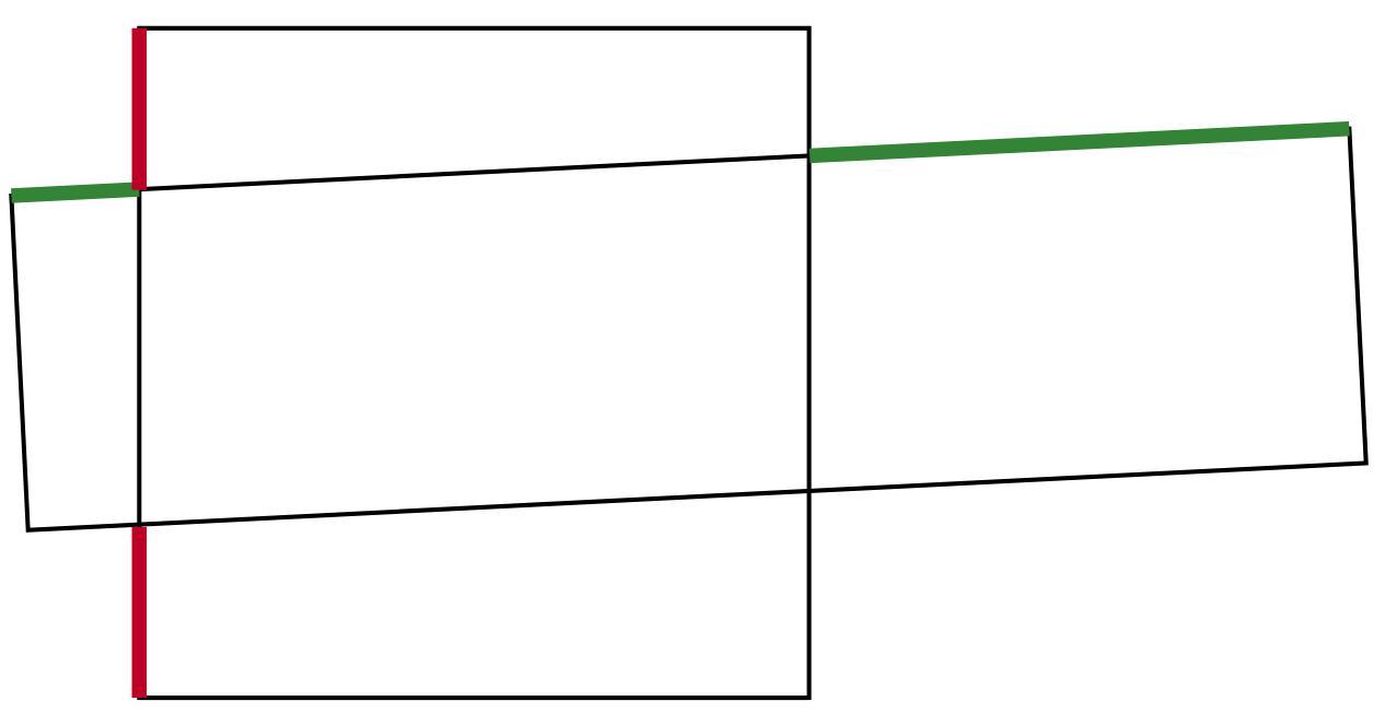 Квадрат 6×6 и прямоугольник 3×12 пересекаются, как показано на рисунке. Докажите, что сумма зелёных отрезков в два раза больше суммы красных отрезков.