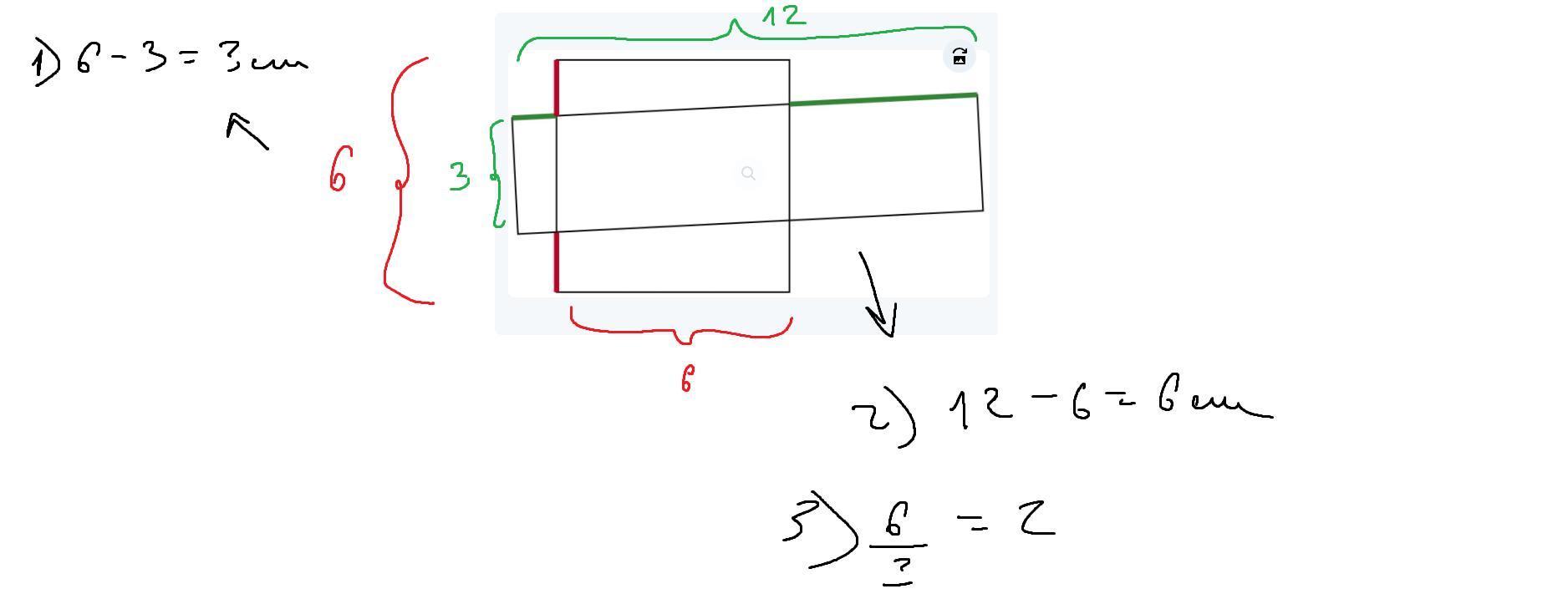 А квадрат со стороной (красной) 6 см пересекает прямоугольник со стороной (зеленой) 12 см, оставляя ему также 6 см.
