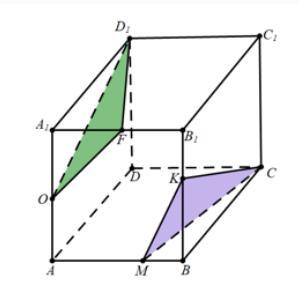 В четырехугольной прямой призме ABCDA1B1C1D1 известно, что АВ=5, ВС=6, а боковое ребро АА1=4. Найдите угол между плоскостью D1FO и плоскостью КСМ (А1F=2, АМ=3, ВК=3, О-середина бокового ребра). Помогите пожалуйста, с решением