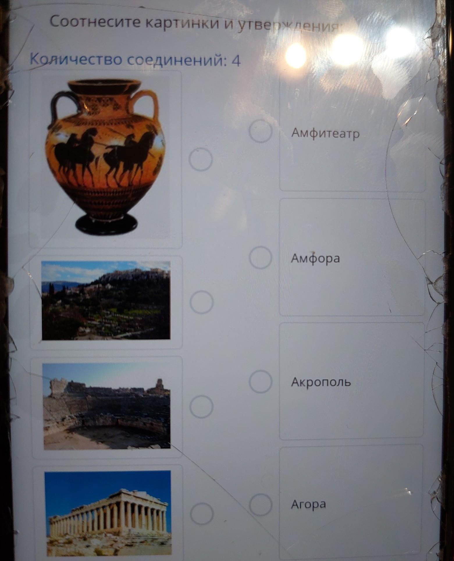 ПОМОГИТЕ СРОЧНО ПЖ;') ТЕКСТ ЗАДАНИЯ Соотнесите картинки и утверждения: Количество соединений: 4 Амфитеатр Амфора Акрополь Агора