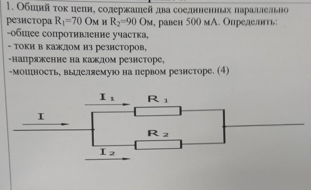 Rобщ = R1×R2/(R1 + R2) = 70×90/160 = 630/16 = 39,375 Ом (поскольку резичторы параллельные)