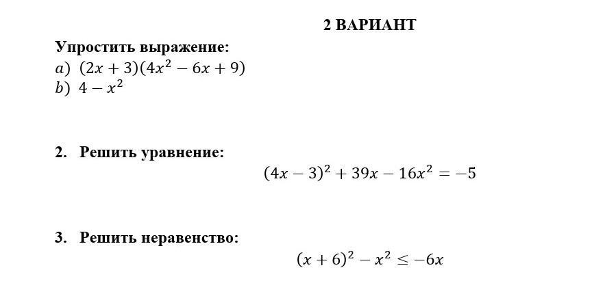 1. упростить выражение а) (2x+3)(4x^-6x+9) b) 4-x^ 2. решить уравнение (4x-3)^+39x-16x^= - 5 3. решить уравнение (x+6)^-x^<-6x