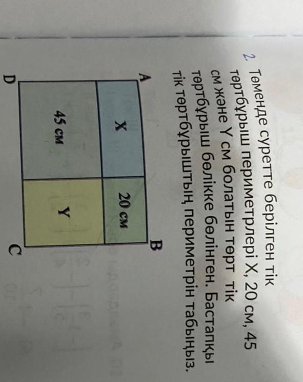 Прямоугольники, показанные на рисунке ниже, разделены на четыре прямоугольника с периметрами X, 20 см, 45 см и Y см. Найдите периметр исходного прямоугольника