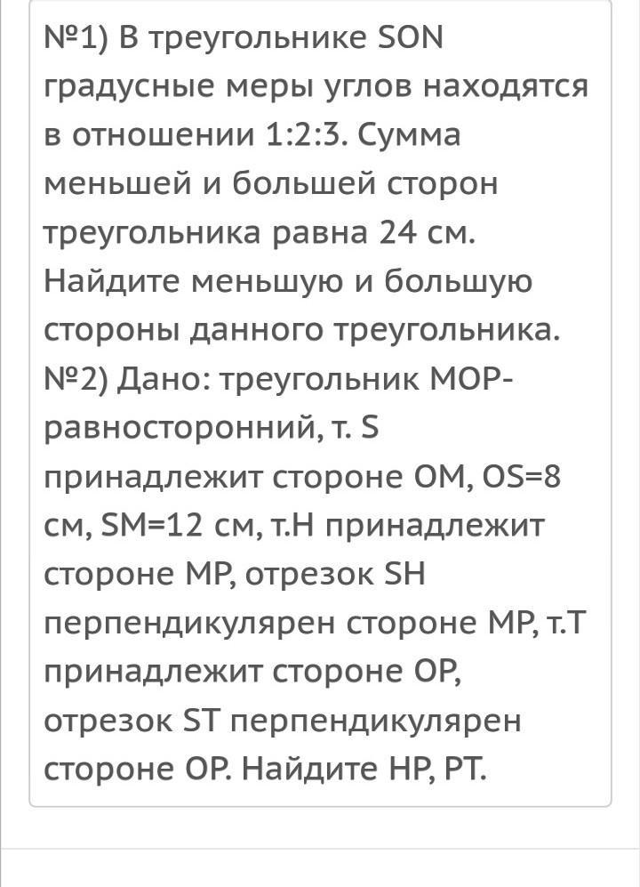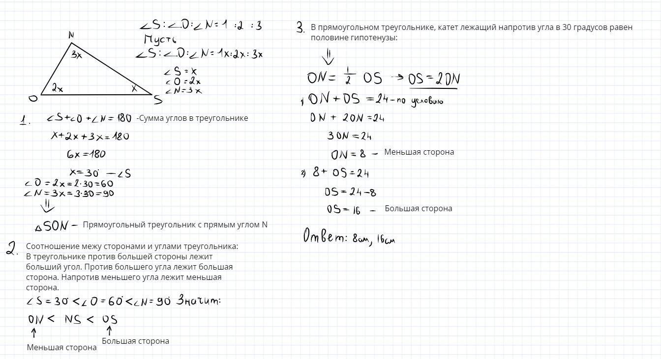 1. В треугольнике SON градусные меры углов находятся в отношении 1:2:3. Сумма меньшей и большей сторон треугольника 24см. Найдите наименьшую и наибольшую стороны данного треугольника