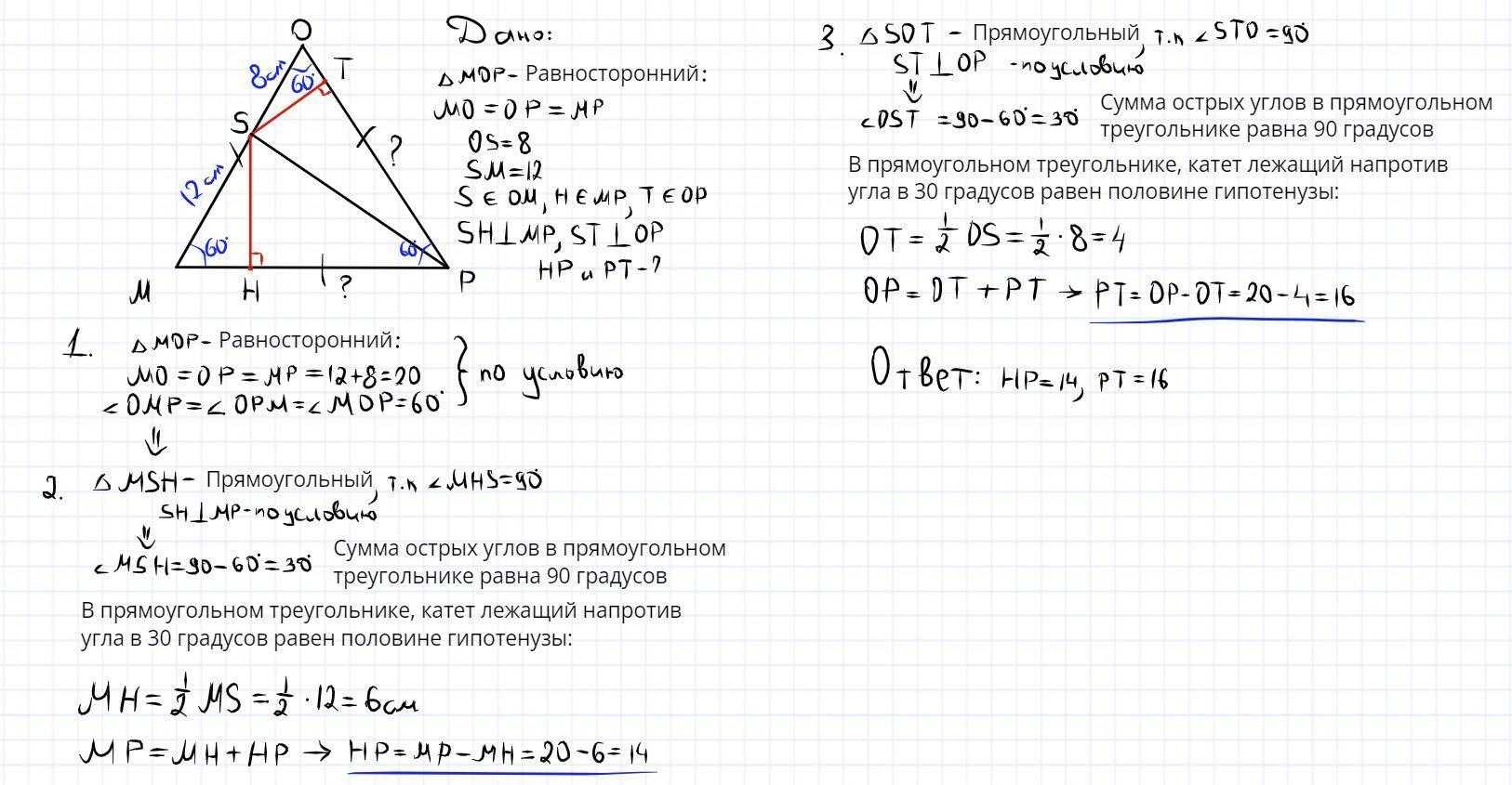 2. Треугольник МОР - равносторонний. т.S принадлежит стороне ОМ, ОS=8см, SM=12см, т.H принадлежит стороне МР, отрезок SH перпендикулярен стороне МР, т.Т принадлежит стороне ОР, отрезок ST перпендикулярен стороне ОР. Найдите НР, РТ?