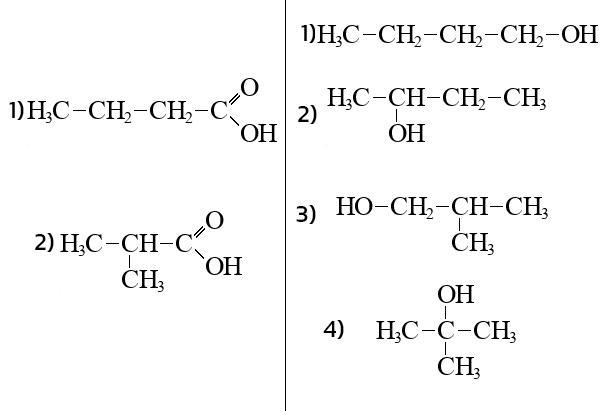 Составьте структурные формулы спирта и карбоновой кислоты, содержащие 4 атома углерода. Назовите полученные вещества.