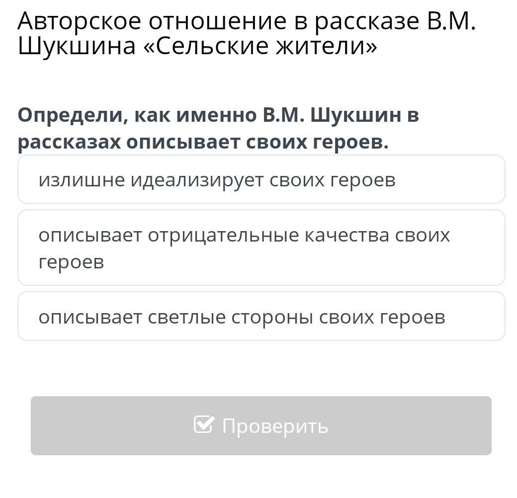 Авторское отношение в рассказе В.М. Шукшина «Сельские жители» Определи, как именно В.М. Шукшин в рассказах описывает своих героев. излишне идеализирует своих героев описывает отрицательные качества своих героев описывает светлые стороны своих героев можно пожалуйста все ответы