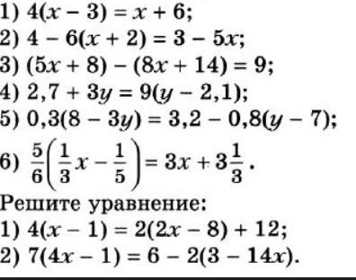 1. 4(х-3)=х+6 2. 4-6(х+2)=3-5х 3. (5х+8)-(8х+14)=9 4. 2,7+3у=9(у-2,1)