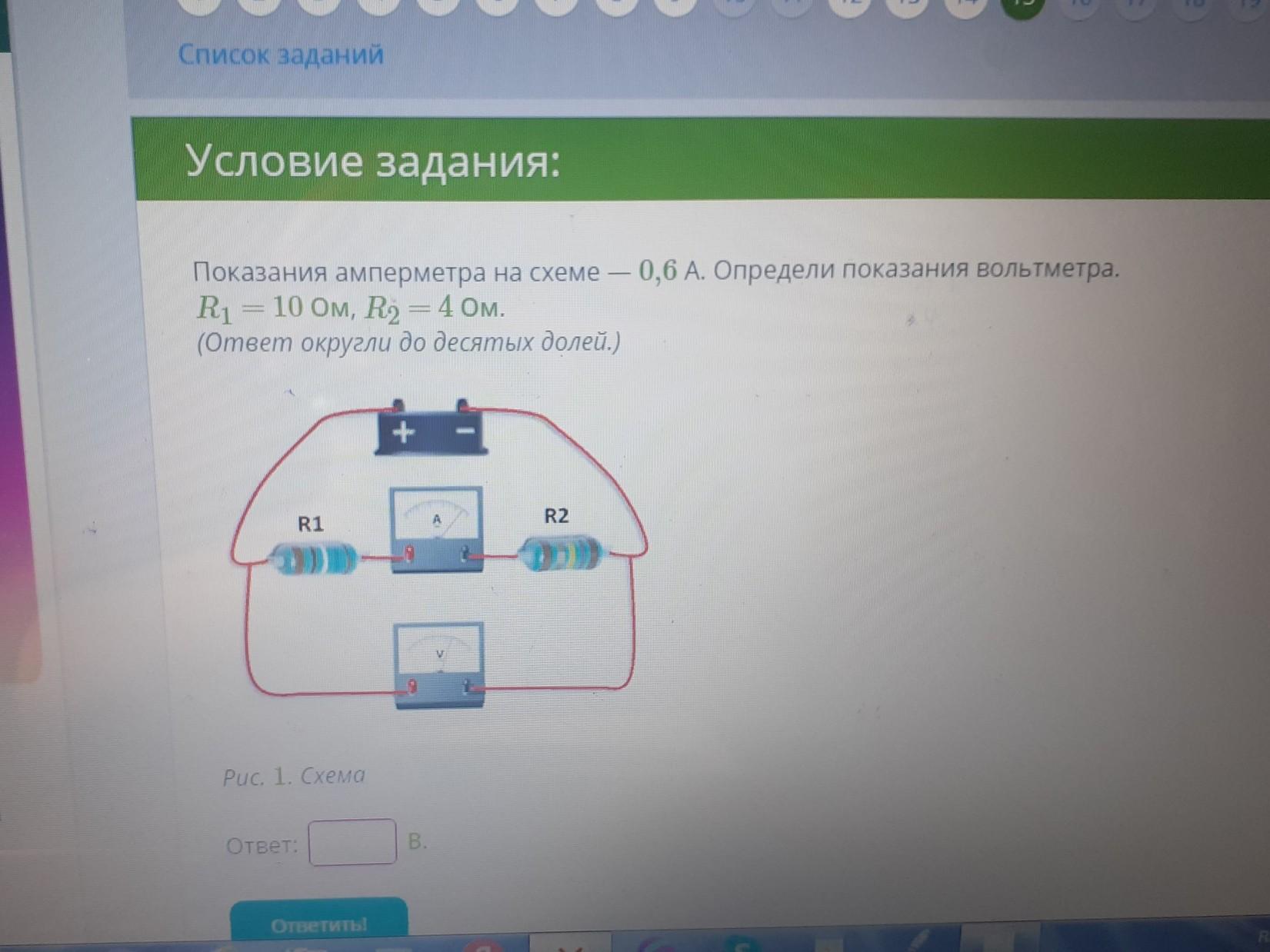 0,6А. Определи показания вольтметра. Показания амперметра на схеме R1 10 Ом, R9 = 4 Ом. (Ответ округли до десятых долей.) + R1 R2 Com Рис. 1. Схема Ответ: В.