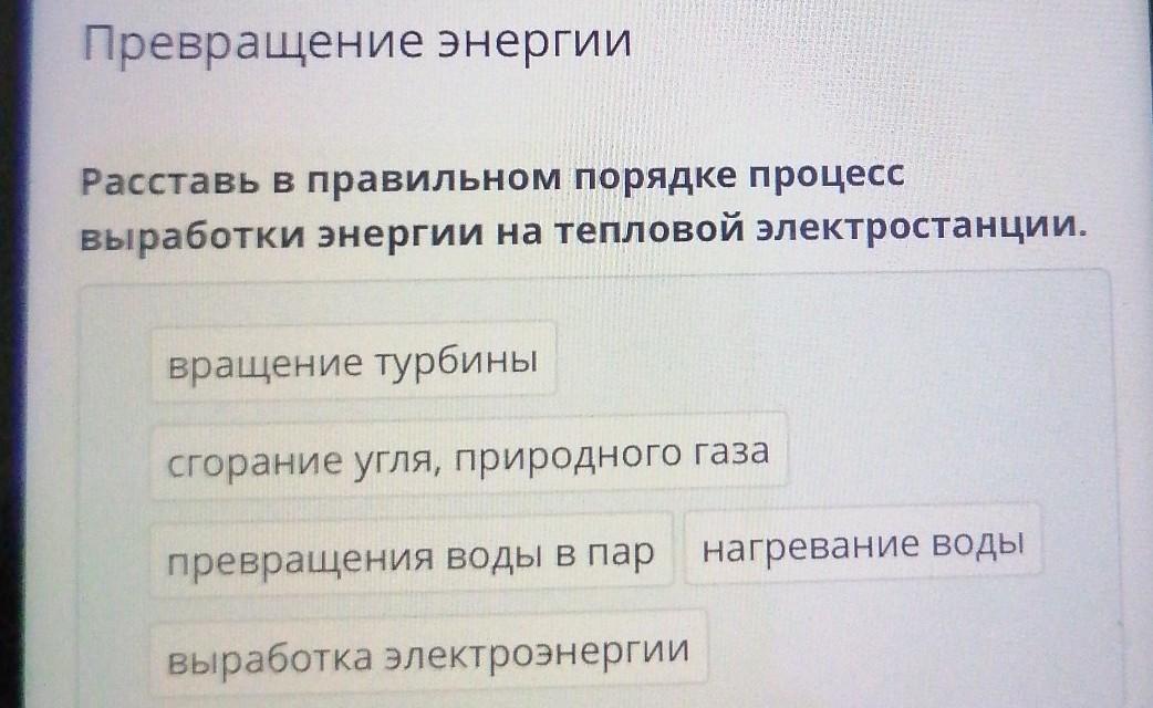 Превращение энергии Расставь в правильном порядке процесс выработки энергии на тепловой электростанции. вращение турбины сгорание угля, природного газа превращения воды В пар нагревание воды выработка электроэнергии